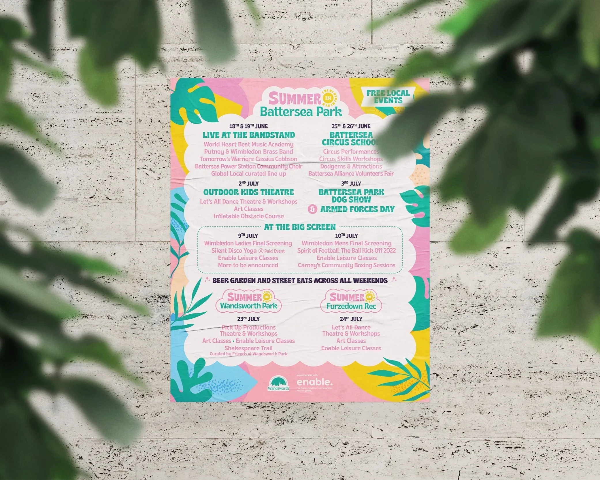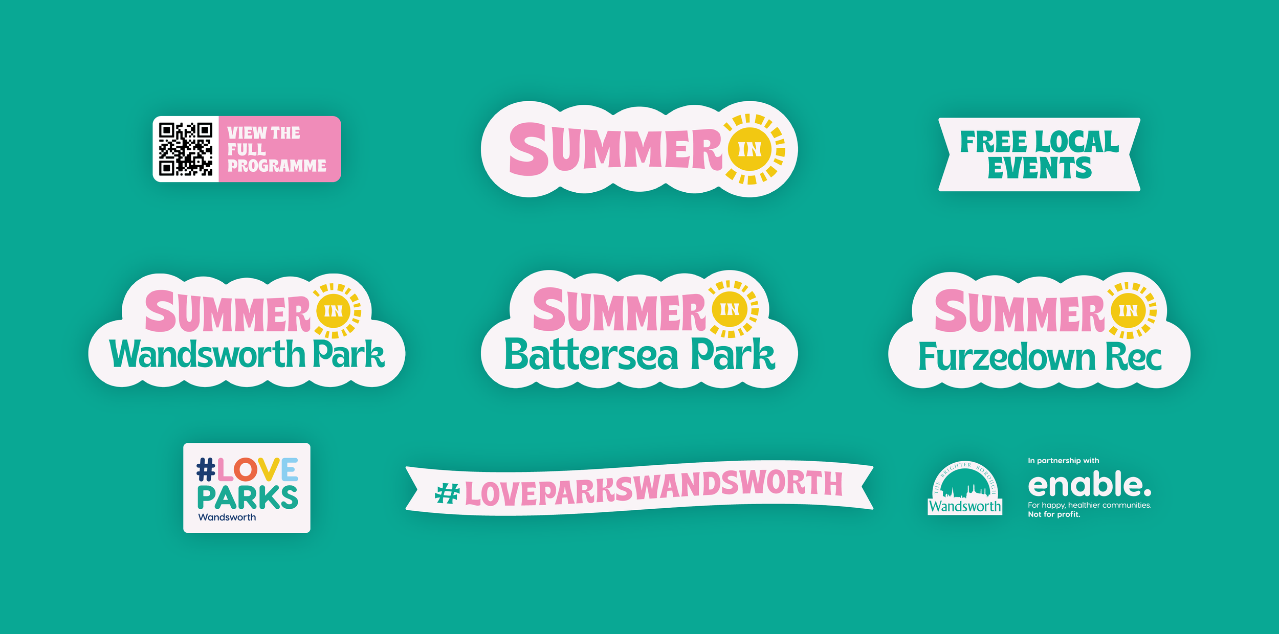 The team at Enable wanted a brand which ‘pops’ - matching the energy of the events and celebrating the parks that host them. It also had to compliment the existing brand style, rather than starting from scratch, to build on the events reputation. Because they work across three separate sites, they needed a logo for each park and an overarching “Summer In” brand mark.
