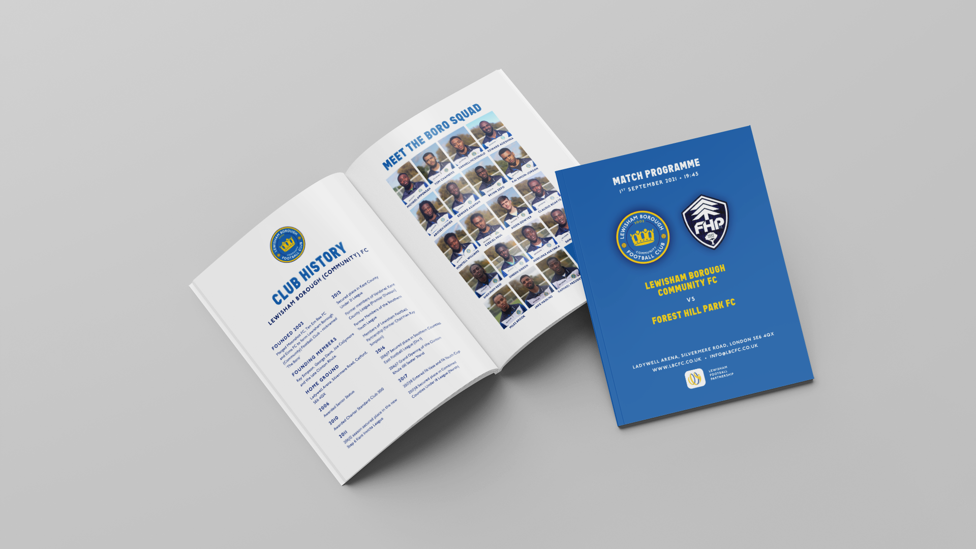 I have worked with LBCFC, on a voluntary basis, since 2021. Starting with the clubs badge, I tidied up and digitised all visual touchpoints of the club. Through the season I have been providing social media assets and programme designs for every home game.